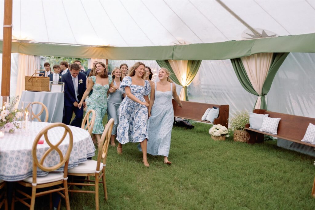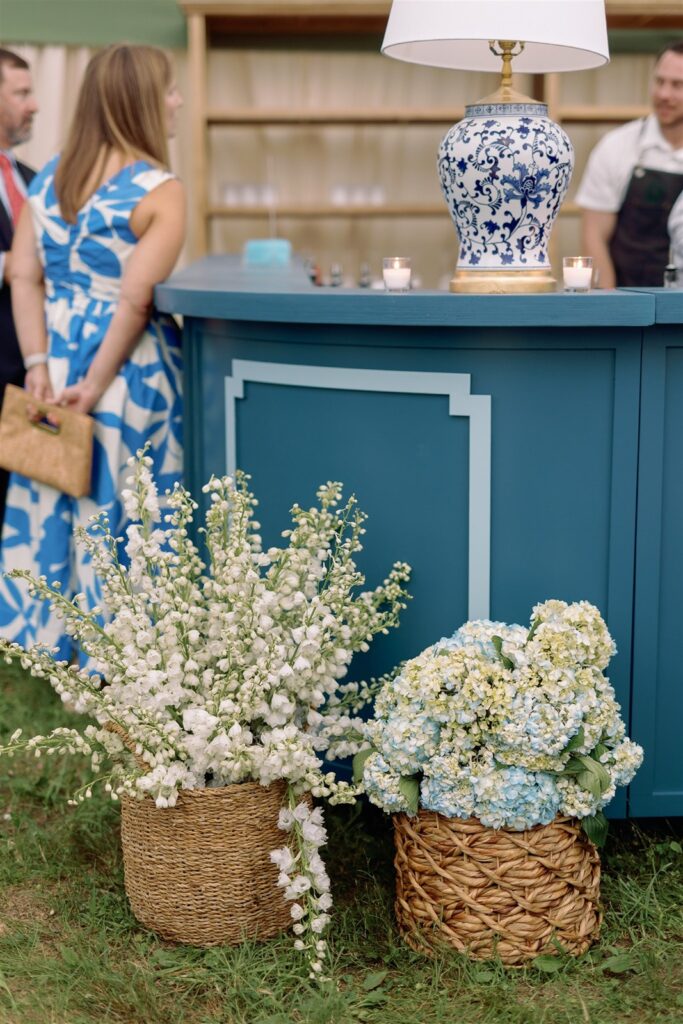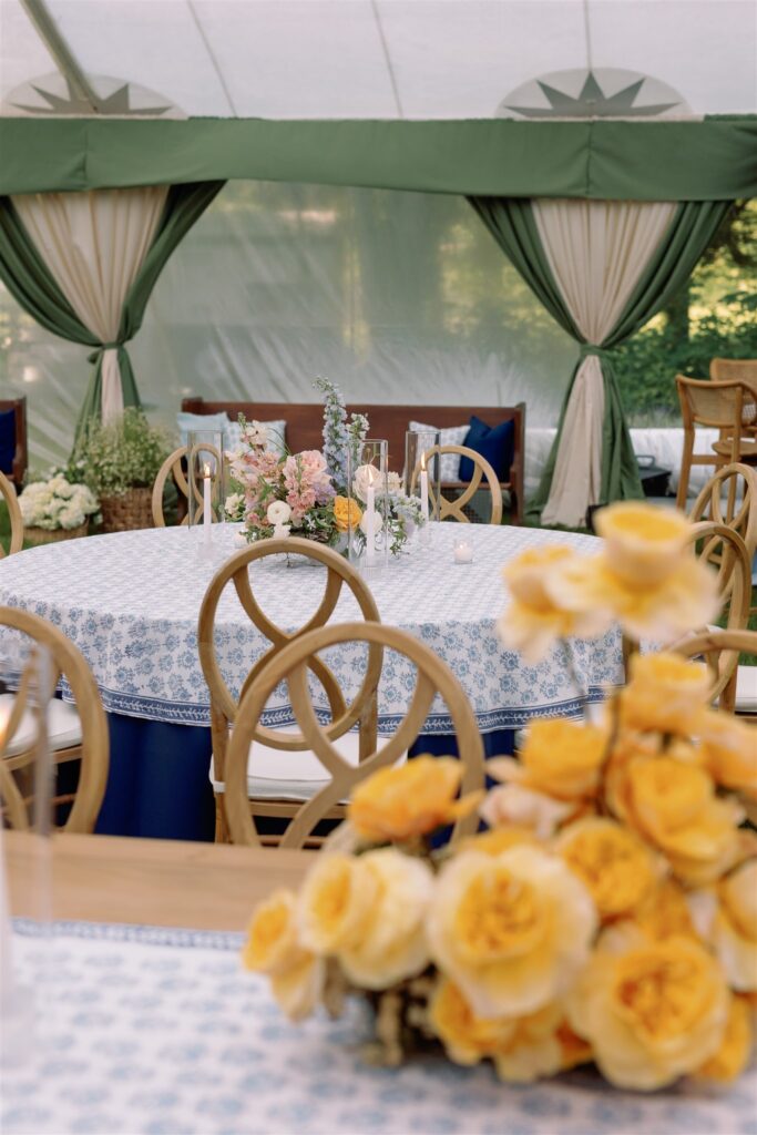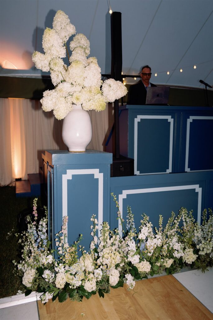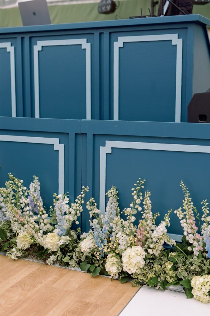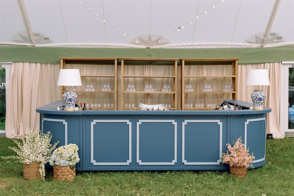 Another priority for Katelyn and her family was creating a comfortable guest experience. Their desire was to give their guests a welcoming environment as soon as they stepped on the property. In Tennessee, the heat is at its peak in July, so air conditioning was an essential addition to the tent to make their guests feel at ease and part of the family. When guests entered the tent, they were greeted with a cool breeze and a refreshing drink at the custom designed bar, painted in Katelyn’s favorite shade of blue. DJ Scott Bishop of Premier Entertainment created an inviting atmosphere for mingling and dancing behind his custom designed stage facade, also painted blue.