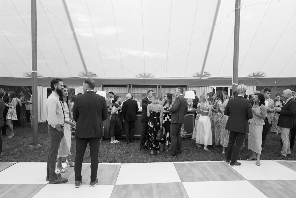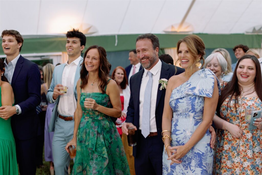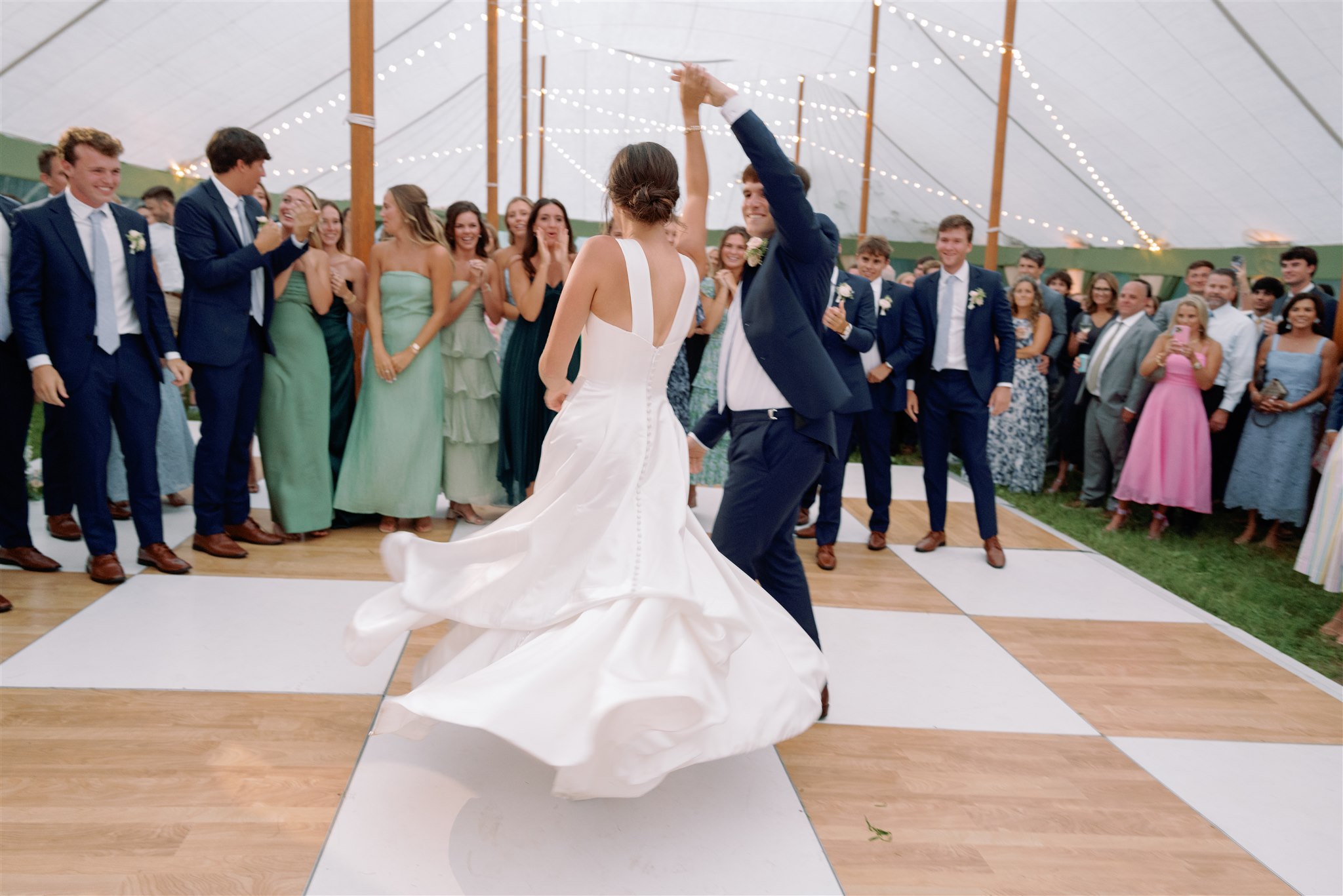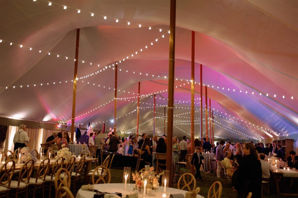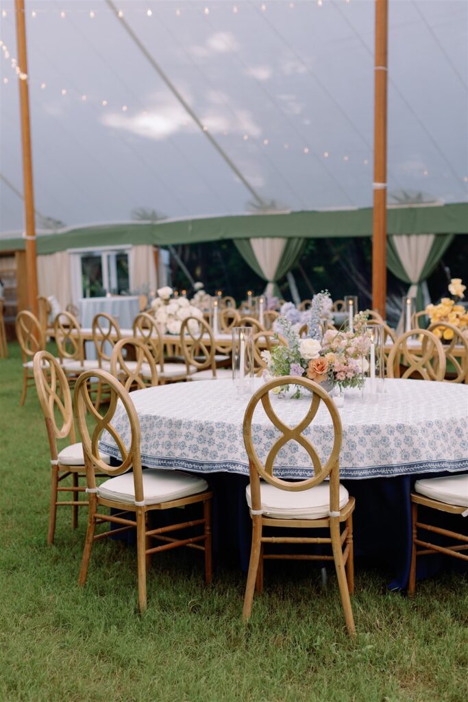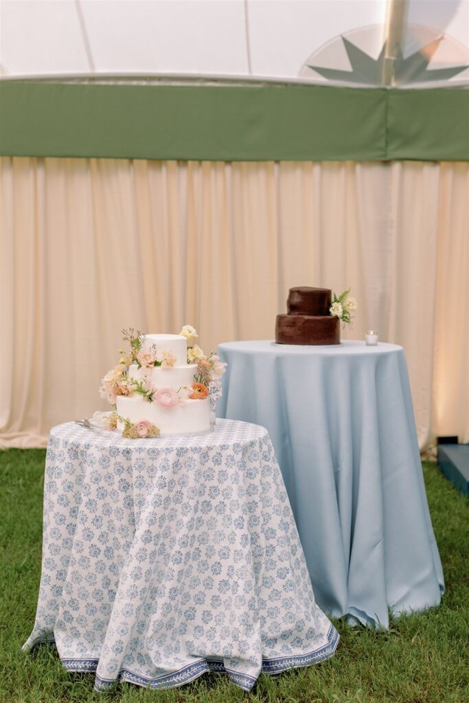 Another priority for Katelyn and her family was creating a comfortable guest experience. Their desire was to give their guests a welcoming environment as soon as they stepped on the property. In Tennessee, the heat is at its peak in July, so air conditioning was an essential addition to the tent to make their guests feel at ease and part of the family. When guests entered the tent, they were greeted with a cool breeze and a refreshing drink at the custom designed bar, painted in Katelyn’s favorite shade of blue. DJ Scott Bishop of Premier Entertainment created an inviting atmosphere for mingling and dancing behind his custom designed stage facade, also painted blue.
