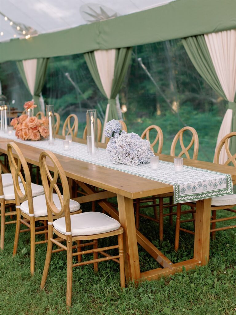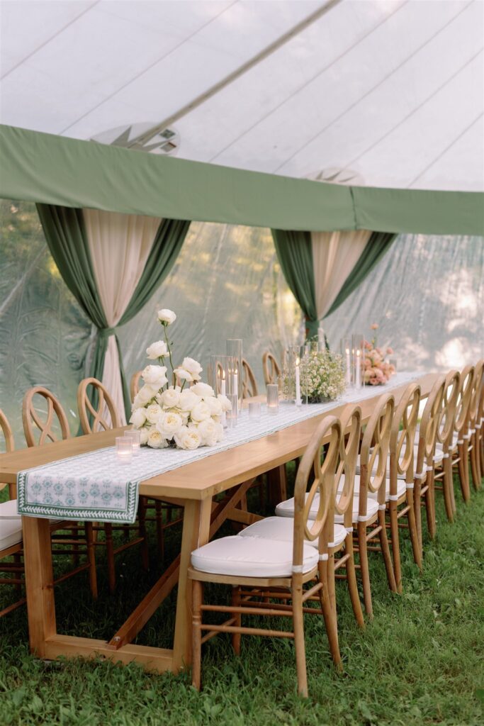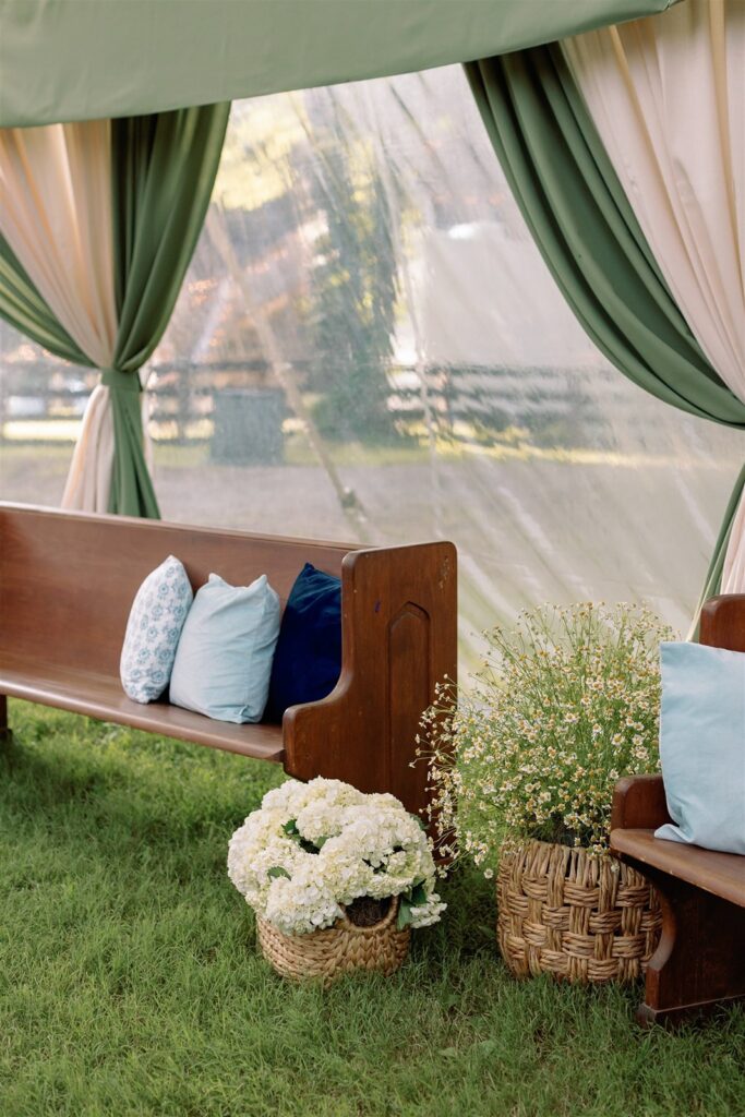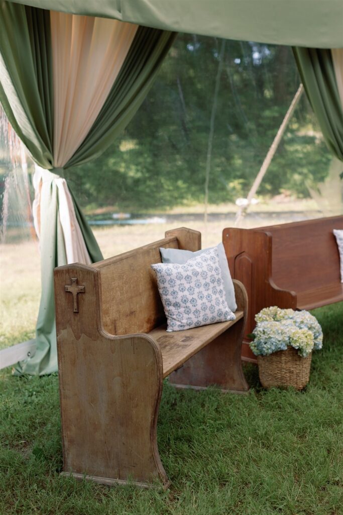 On the farm, Presley discovered several old church pews and immediately knew they belonged in the reception tent. They offered a meaningful connection to the couple’s deep and steady faith, creating the perfect first impression as guests entered the tent.